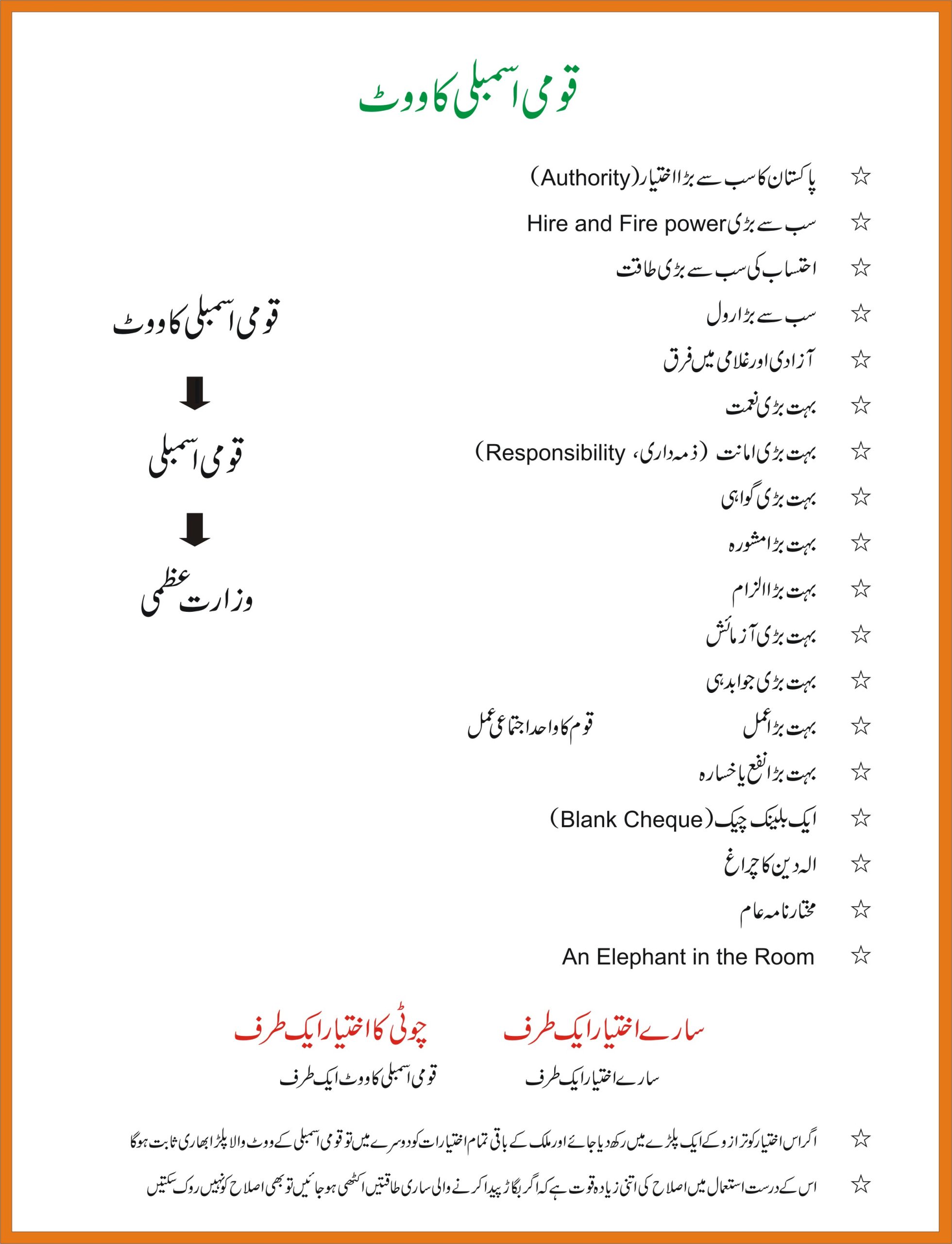 میری تحقیق کے مطابق پاکستان کےدیرینہ اور بڑے مسائل کی چار بنیادی وجوہات یہ ہیں: بے عمل ووٹر، قومی اسمبلی(دارالعوام کی بجائے)، لمبی ٹرم اور لا محدود بار وزارت عظمی۔